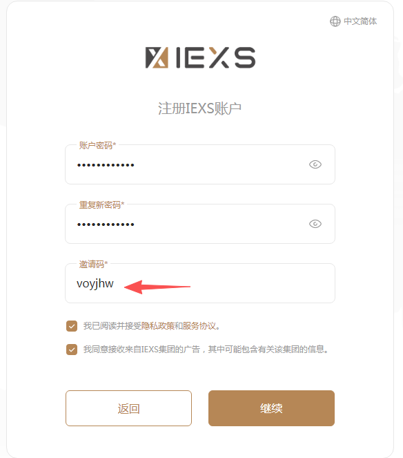 3. 设置登录密码,确认邀请码“voyjhw”协议打√,点继续
